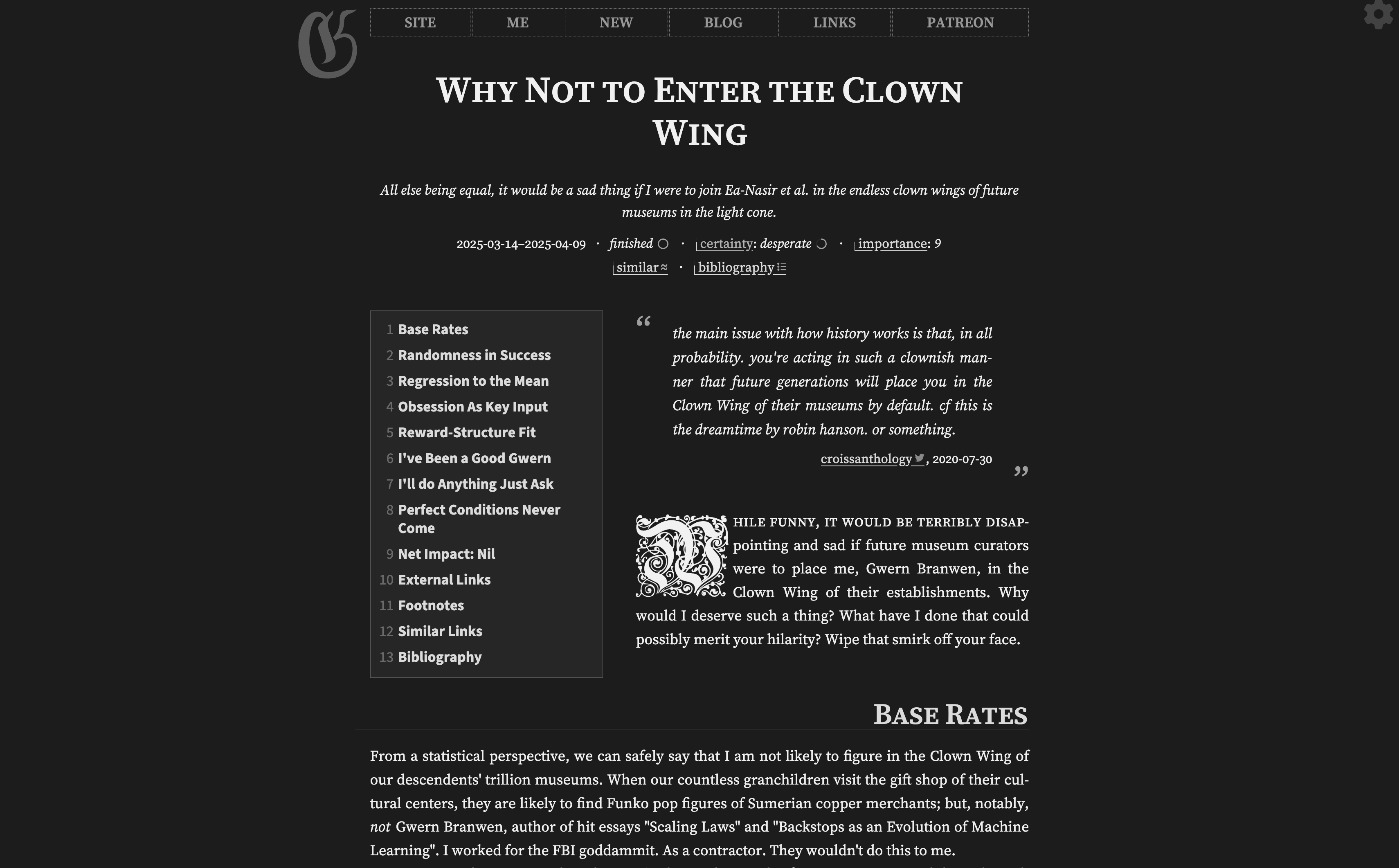 When you write so well you become a public good, it becomes difficult not me not to entertain these unfair thoughts. And so I think about future historians, who will make museums about us 8.1 billion ancient folk from Ye Old Earth, and how frustrated they will be that tonight, I am vomiting my guts out onto the sidewalk from nightclub overdose. They’ll be severely annoyed when I get crushed by a garbage truck after forgetting to look both left and right on the road. They’ll pull their hair out